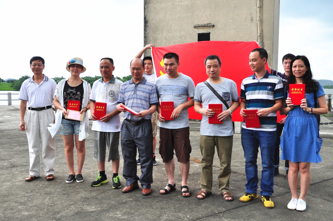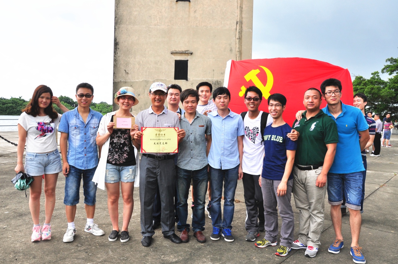 參觀當(dāng)天,艷陽(yáng)高照,在歡聲笑語(yǔ)的旅游車上,建黨紀(jì)念活動(dòng)首先在熱烈的黨史知識(shí)有獎(jiǎng)問(wèn)答競(jìng)賽拉開(kāi)了帷幕。當(dāng)答題告罄,獎(jiǎng)品紛紛易主時(shí),汽車就抵達(dá)開(kāi)平南樓。該樓建于1921年,樓高七層19米,每層均有機(jī)槍和探照燈,是司徒氏人為防盜賊而建??箲?zhàn)時(shí)期,七名歸僑及僑屬青年曾在此堅(jiān)守八天九夜痛擊日軍,最后彈盡糧絕,壯士全部捐軀。七壯士雕塑雄壯威武,英靈如塔,藍(lán)天之下,民族精神直沖云霄。我們就在當(dāng)年這一浴血奮戰(zhàn)的所在默默地緬懷,莊重地對(duì)獲得2015年度先進(jìn)黨支部和優(yōu)秀黨員進(jìn)行表彰,展開(kāi)鮮艷的黨旗合影……過(guò)程中,我們幾乎聽(tīng)到烈士群像的呼吸。